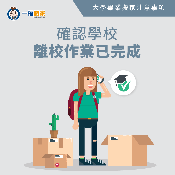 在處理大學畢業搬家事宜前,一定要先確認學校事務是否已經處理完畢了,由於有部分的教授給成績的時間比較晚,學校的離校手續繁複且需要親自處理,所以在進行搬家前一定要確保自己的學分已修足、離校手續也已經處理完畢,以免在搬家過程中會被學校事務而擾亂了手腳唷!