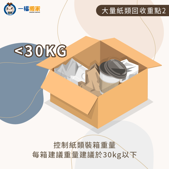 在裝箱時,許多人常常認為紙類很輕,因此會把紙張塞滿整個紙箱。然而,當紙箱裝得太滿時,會變得非常沉重,導致無法搬運或紙箱破裂的情況頻繁發生。為了避免這個狀況,在裝箱時,建議控制每箱的重量不要超過30公斤,確保紙箱在搬運過程中不會因過重而破損,也能減少搬運過程中的風險。為了確認紙箱的重量是否在可搬運的範圍內,可以使用以下幾個方法:
